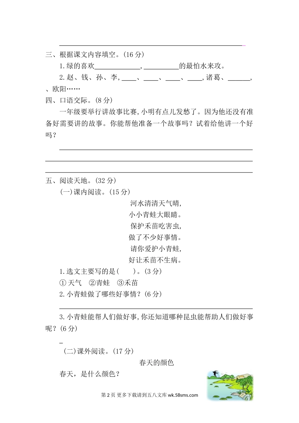 第一单元提升练习一、字词乐园。(28分)1.给加点的字选择正确读音,画“√”。(5分)秋霜(shāngshuāng)降保(báobǎo)护生病(bìnbìng)相(xāngxiāng)遇害怕(báipà)2.看拼音,写词语。(12分)chūnfēngxuěhuā...