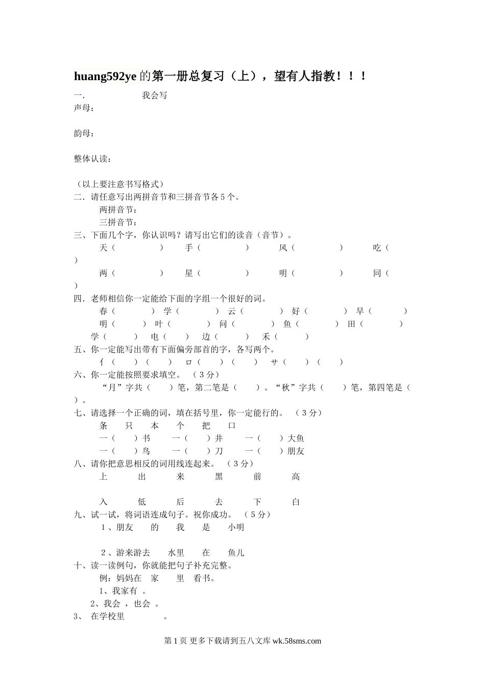huang592ye的第一册总复习(上),望有人指教!!!一.我会写声母:韵母:整体认读:(以上要注意书写格式)二.请任意写出两拼音节和三拼音节各5个。两拼音节:三拼音节:三、下面几个字,你认识吗?请写出它们...