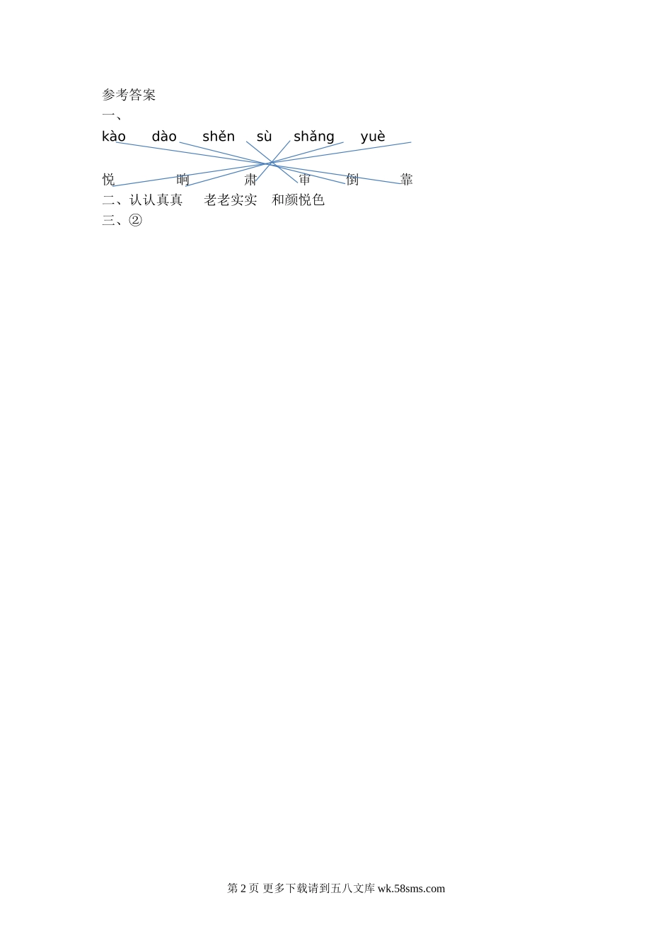 第二课时一、连一连。kàodàoshěnsùshǎngyuè悦晌肃审倒靠二、补充词语。()地看()地画()地说三、对老师的话,理解正确的一项是()①不同一个事物,从不同的角度去看,会有不同的样子。②同一个事物,...