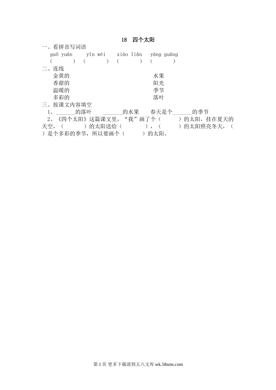 18四个太阳一、看拼音写词语ɡuǒyuányīnwèixiàoliǎnyánɡɡuānɡ()()()()二、连线金黄的水果香甜的阳光温暖的季节多彩的落叶三、按课文内容填空1、_______的落叶_______的水果春天是个_______的...