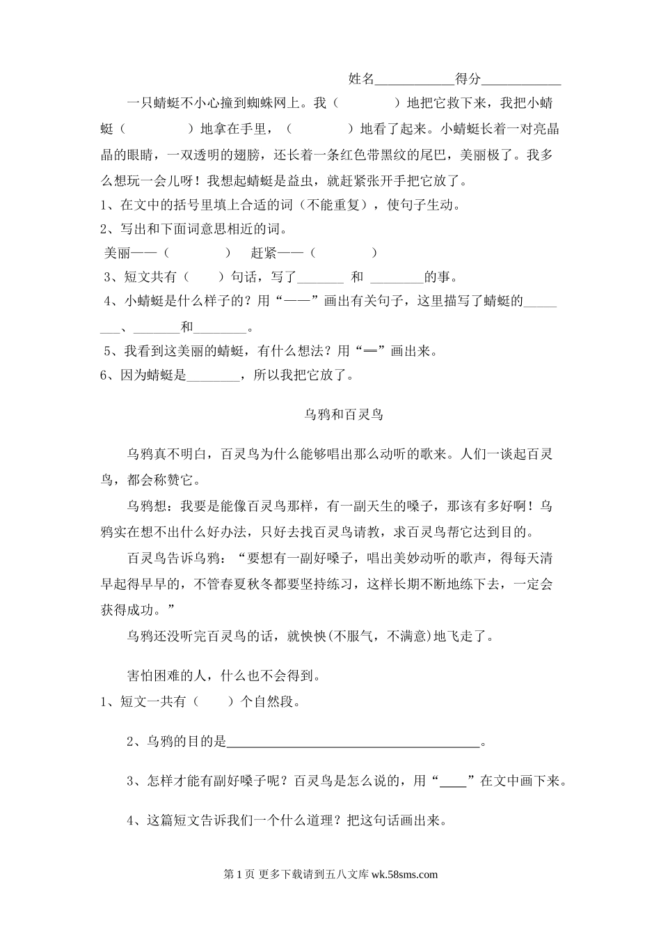 姓名______得分______一只蜻蜓不小心撞到蜘蛛网上。我()地把它救下来,我把小蜻蜓()地拿在手里,()地看了起来。小蜻蜓长着一对亮晶晶的眼睛,一双透明的翅膀,还长着一条红色带黑纹的尾巴,美...