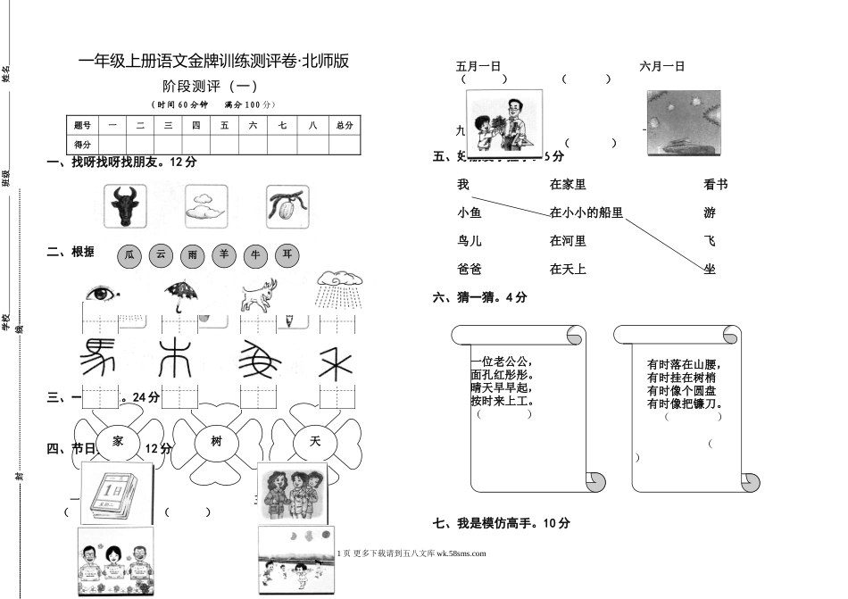 一年级上册语文金牌训练测评卷·北师版阶段测评(一)(时间60分钟满分100分)题号一二三四五六七八总分得分一、找呀找呀找朋友。12分二、根据图画写汉字。16分三、一字开花。24分四、节日我知道。12分一月一日三...