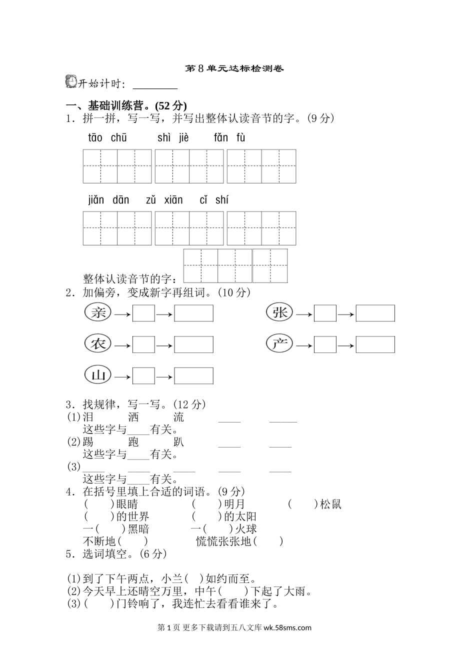 第8单元达标检测卷开始计时:________一、基础训练营。(52分)1.拼一拼,写一写,并写出整体认读音节的字。(9分)tāochūshìjièfǎnfùjiǎndānzǔxiāncǐshí整体认读音节的字:2.加偏旁,变成新字再组词。...