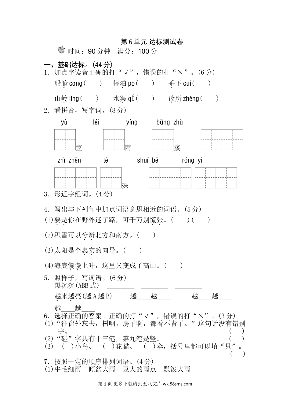 第6单元达标测试卷时间:90分钟满分:100分一、基础达标。(44分)1.加点字读音正确的打“√”,错误的打“×”。(6分)船舱cāng()停泊pō()垂下cuí()山岭lǐng()水渠qǘ()诊所zhěng()2.看拼音,写字词。(8分)y...