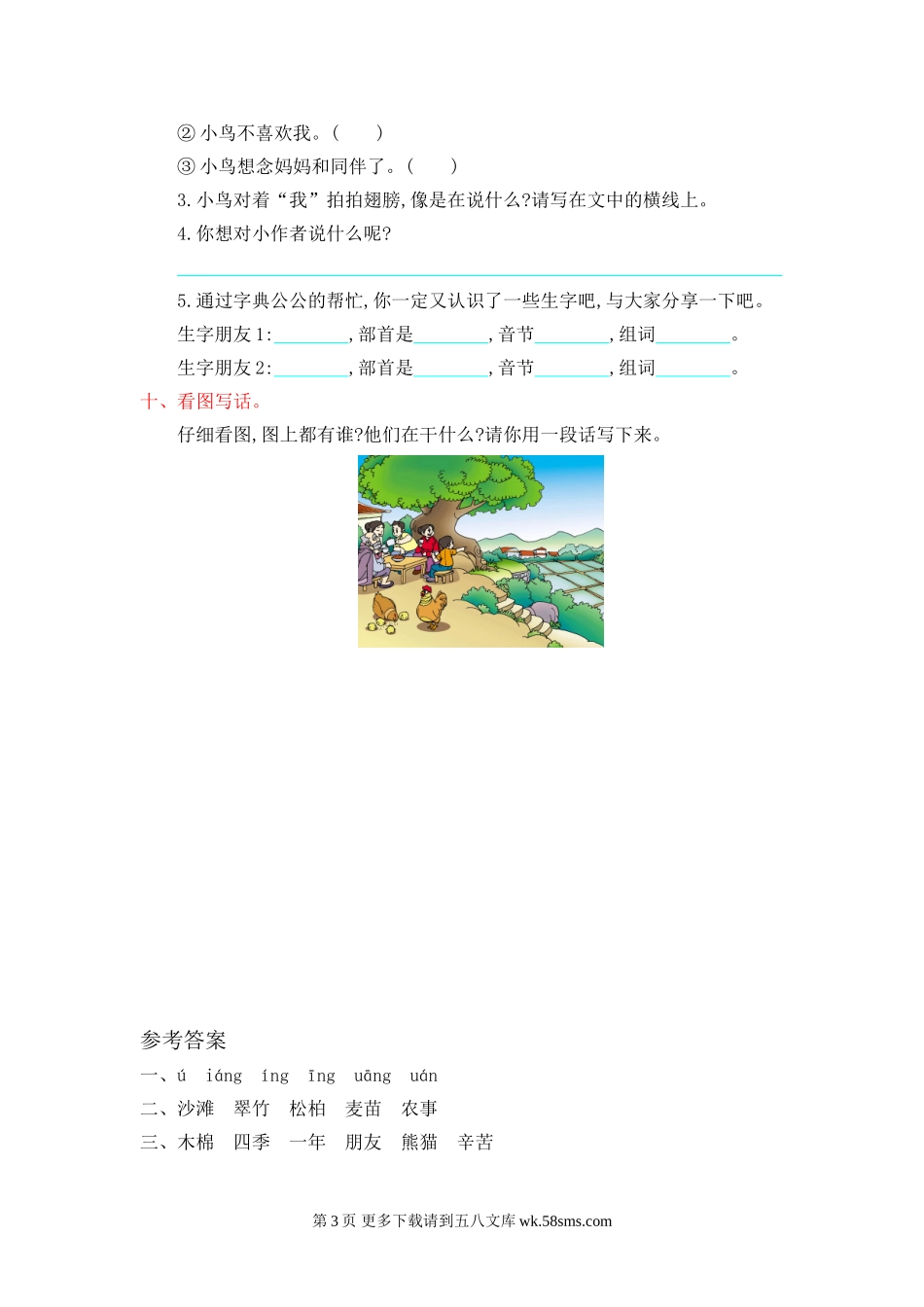 第二单元提升练习一、把下列字的音节补充完整。wxl梧翔灵yzhy鹰装园二、连字成词。沙翠松麦农苗柏事滩竹三、看拼音,写词语。四、按要求填空。1.“萄”是结构,部首是,除去部首有画。2.“笨”是结构,部首是,共有画...