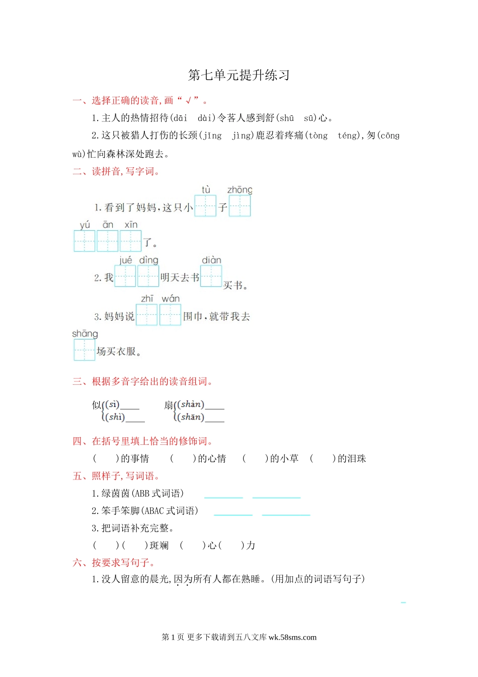第七单元提升练习一、选择正确的读音,画“√”。1.主人的热情招待(dāidài)令茖人感到舒(shūsū)心。2.这只被猎人打伤的长颈(jǐngjìng)鹿忍着疼痛(tòngténg),匆(cōnɡwù)忙向森林深处跑去。www.21-cn-jy....