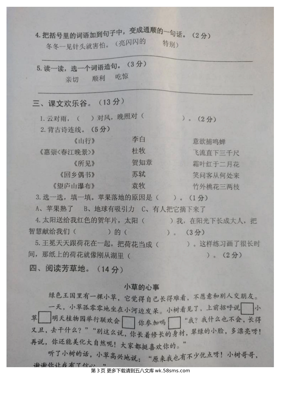 2016-2017学年度上学期台安县小学二年级语文期末考试试题.doc_第3页