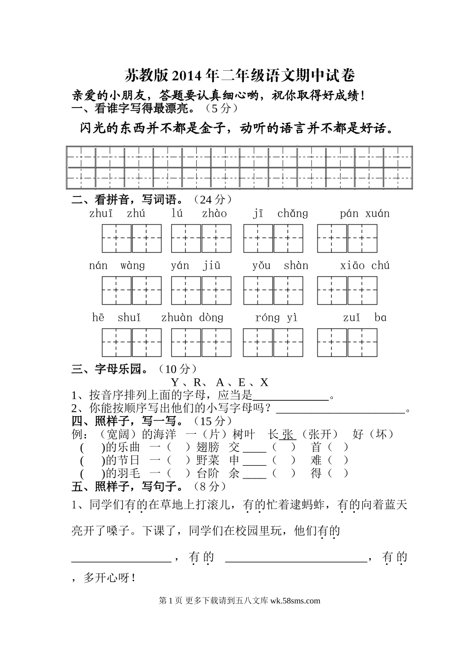 苏教版2014年二年级语文期中试卷亲爱的小朋友,答题要认真细心哟,祝你取得好成绩!一、看谁字写得最漂亮。(5分)闪光的东西并不都是金子,动听的语言并不都是好话。二、看拼音,写词语。(24分)zhuīzhúlúzh...
