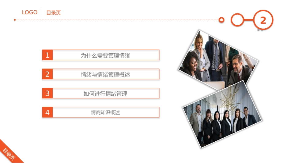 LOGO情绪管理指南员工在职培训之——点击此处,写上您公司的名称V1LOGO目录页2目录页1为什么需要管理情绪2情绪与情绪管理概述3如何进行情绪管理4情商知识概述LOGO过渡页3过渡页为什么需要管理情绪1请思考:不管理...