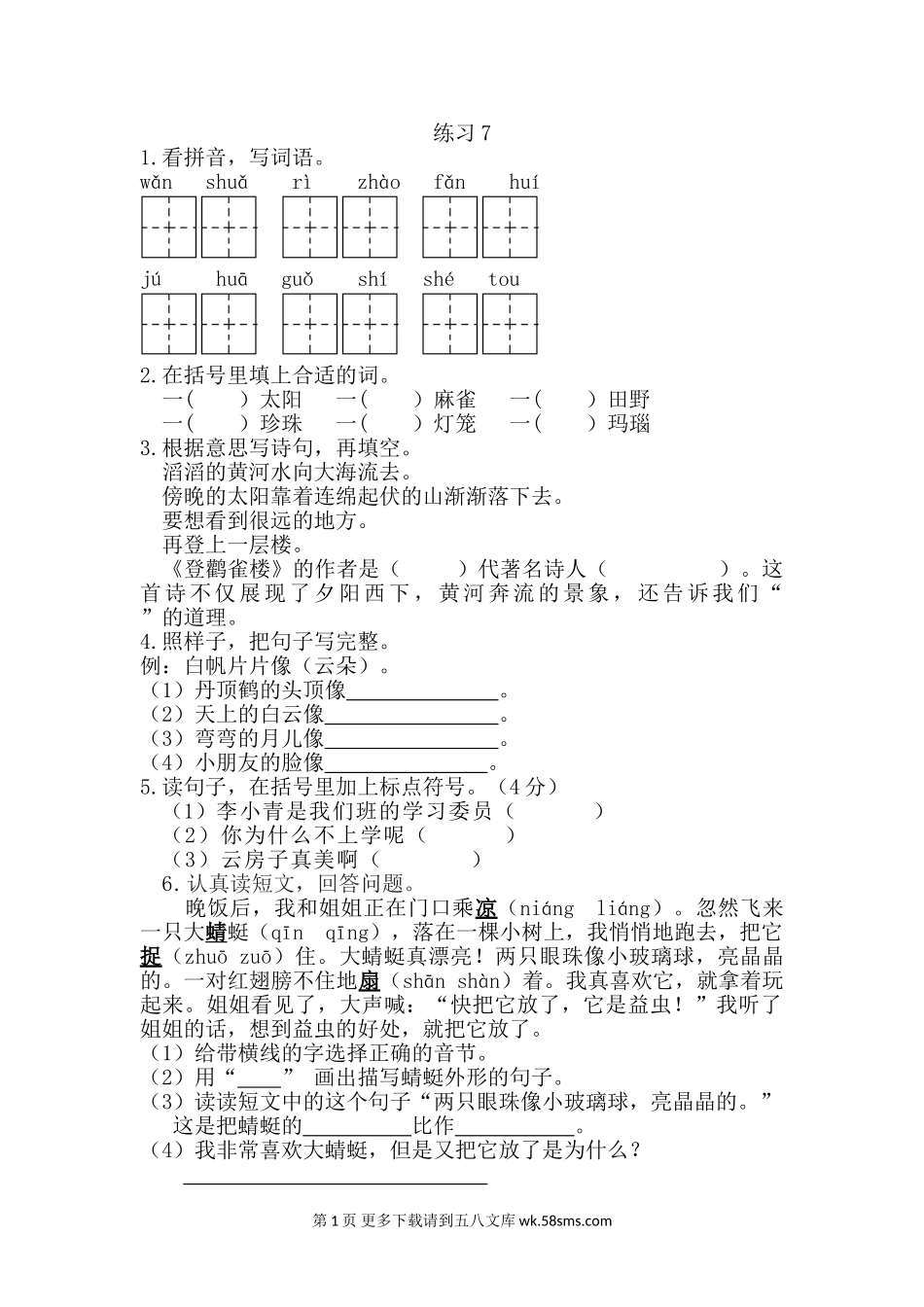 练习71.看拼音,写词语。wǎnshuǎrìzhàofǎnhuíjúhuāguǒshíshétou2.在括号里填上合适的词。一()太阳一()麻雀一()田野一()珍珠一()灯笼一()玛瑙3.根据意思写诗句,再填空。滔滔的黄河水向大海流去...