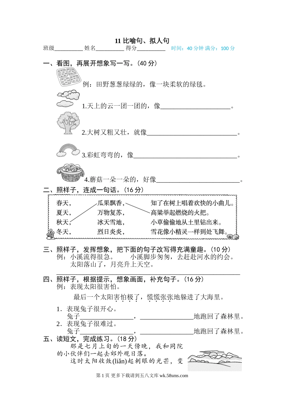 11比喻句、拟人句班级__________姓名__________得分__________时间:40分钟满分:100分一、看图,再展开想象写一写。(40分)例:田野葱葱绿绿的,像一块柔软的绿毯。1.天上的云一团一团的,像____________________...