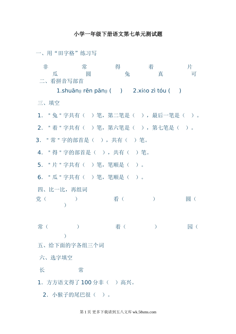 小学一年级下册语文第七单元测试题一、用“田字格”练习写非常得着片瓜圆兔真可二、看拼音写部首1.shuānɡrēnpānɡ()2.xiǎozìtóu()三、填空1."兔"字共有()笔,第二笔是(),最后一笔是()。2."着...