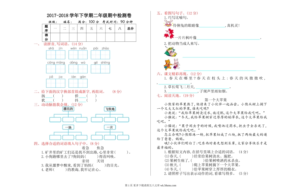 2017-2018学年下学期二年级期中检测卷班级:姓名:满分:100分考试时间:90分钟题序一二三四五六七八总分得分一、读拼音,写词语。(14分)二、给下面的汉字换部首组成新字,再组词。(8分)扬()侨()犹()抖()三、动动脑...