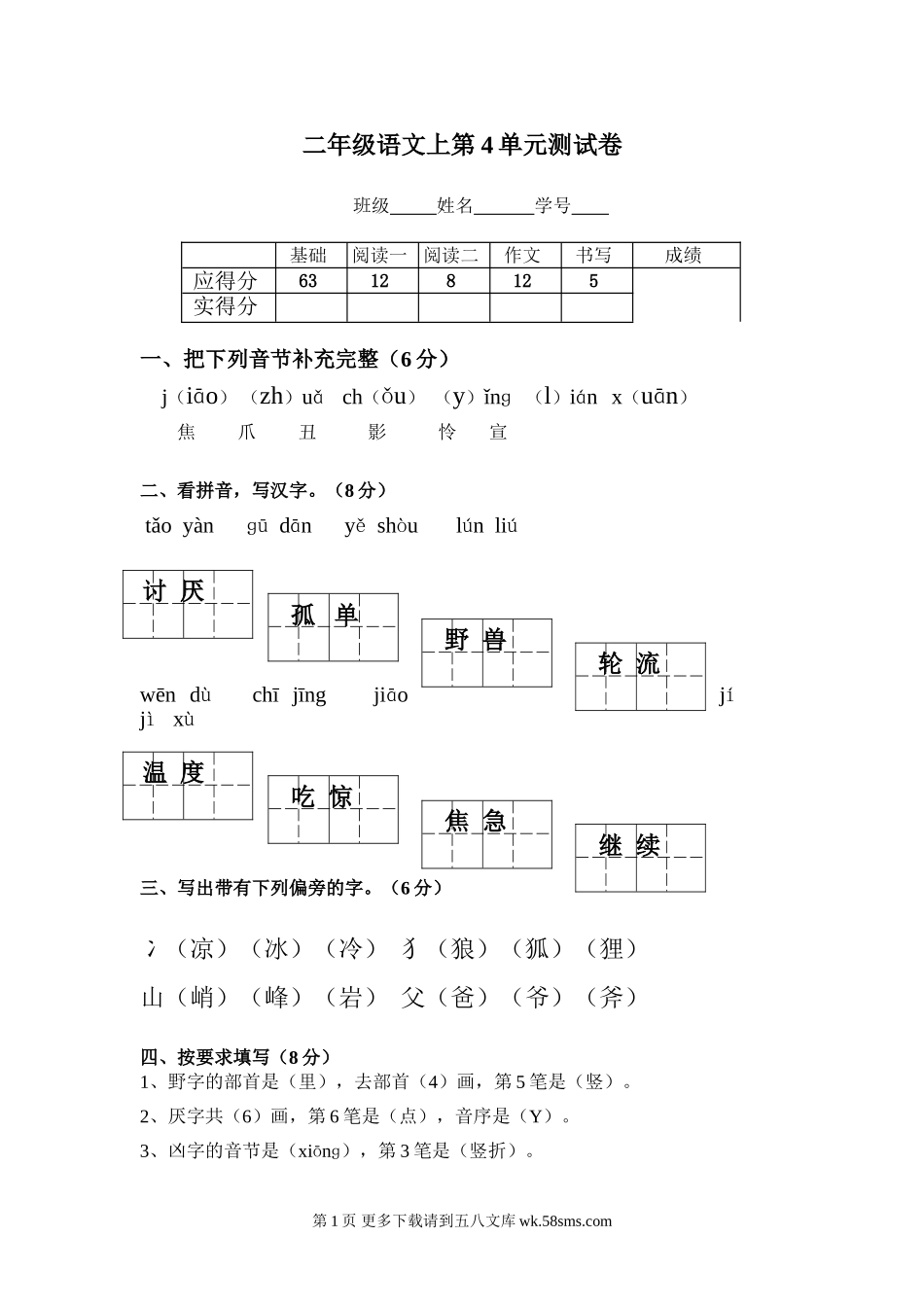 讨厌孤单野兽轮流温度吃惊焦急继续二年级语文上第4单元测试卷班级姓名学号基础阅读一阅读二作文书写成绩应得分63128125实得分一、把下列音节补充完整(6分)j(iāo)(zh)uǎch(ǒu)(y)ǐnɡ(l)iánx(u...