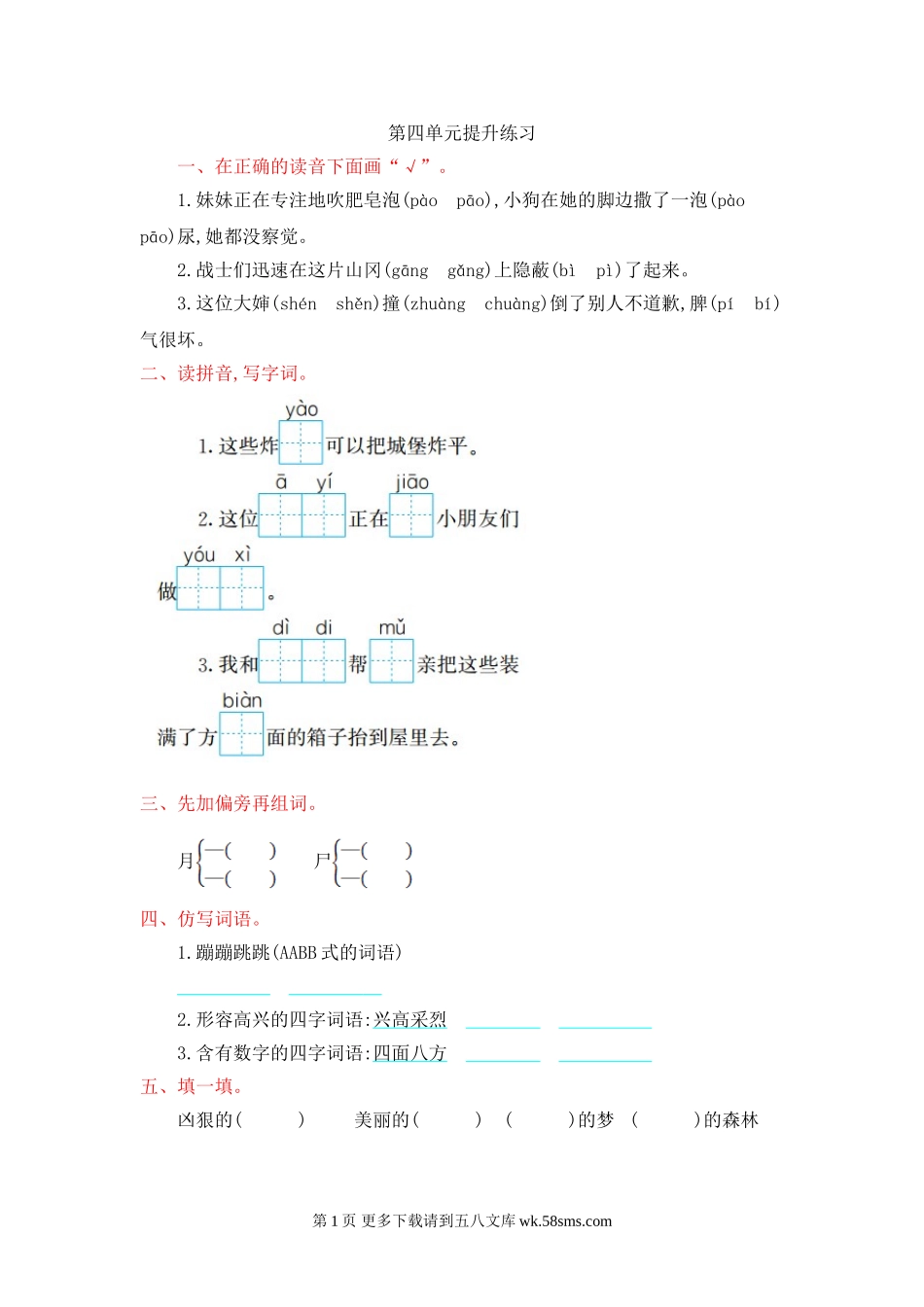第四单元提升练习一、在正确的读音下面画“√”。1.妹妹正在专注地吹肥皂泡(pàopāo),小狗在她的脚边撒了一泡(pàopāo)尿,她都没察觉。2.战士们迅速在这片山冈(gānggǎng)上隐蔽(bìpì)了起来。3.这位大婶(sh...