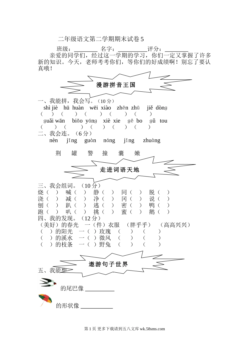 二年级语文第二学期期末试卷5班级:名字:评分:亲爱的同学们,经过这一学期的学习,你们一定又掌握了许多新的知识。今天,老师考考你们,等你们的好成绩啊!别忘了要认真哦!一、我能拼,我会写。(10分)shìji...