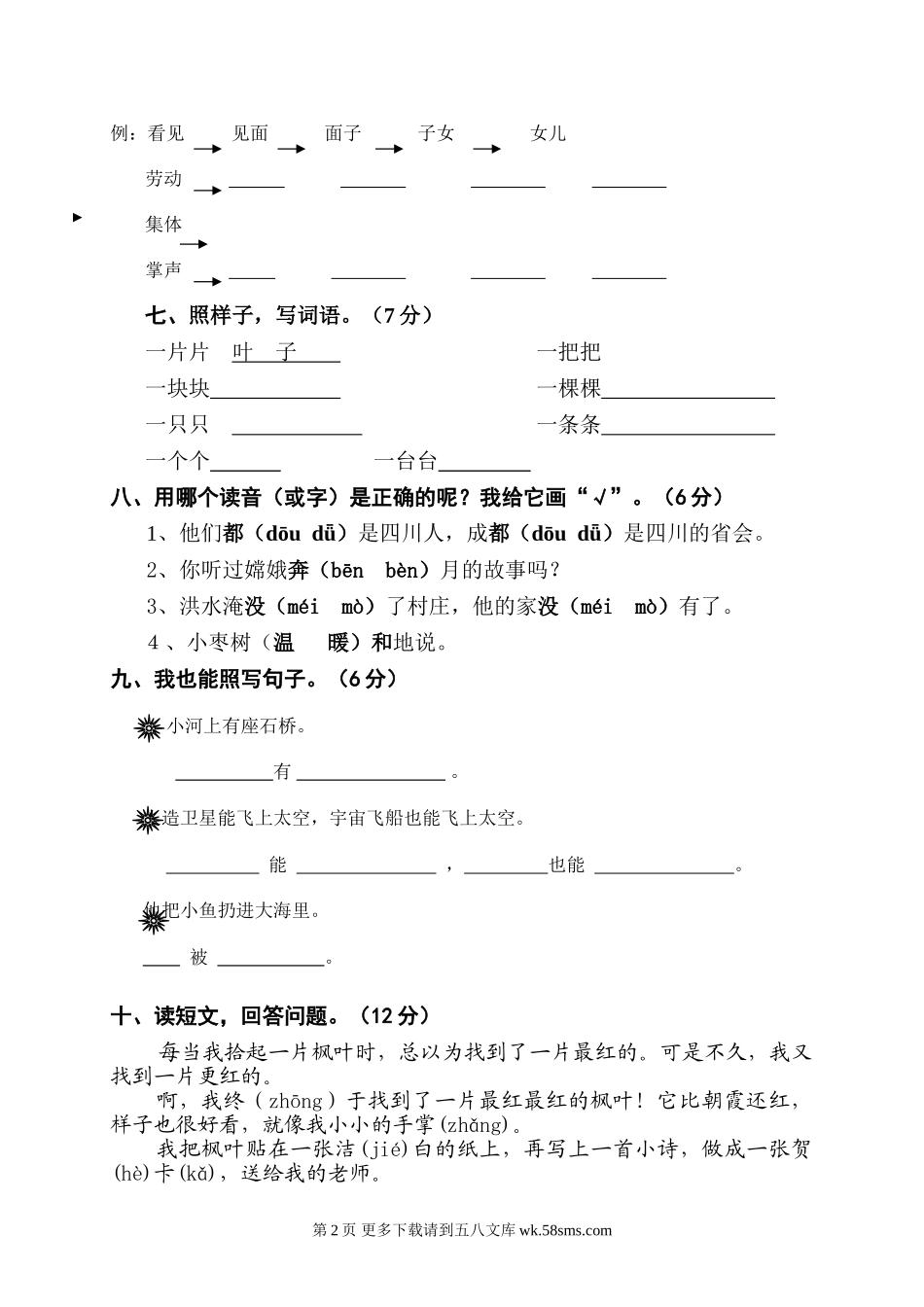 隔界河小学二年级语文上册第四次月考试卷.doc_第2页
