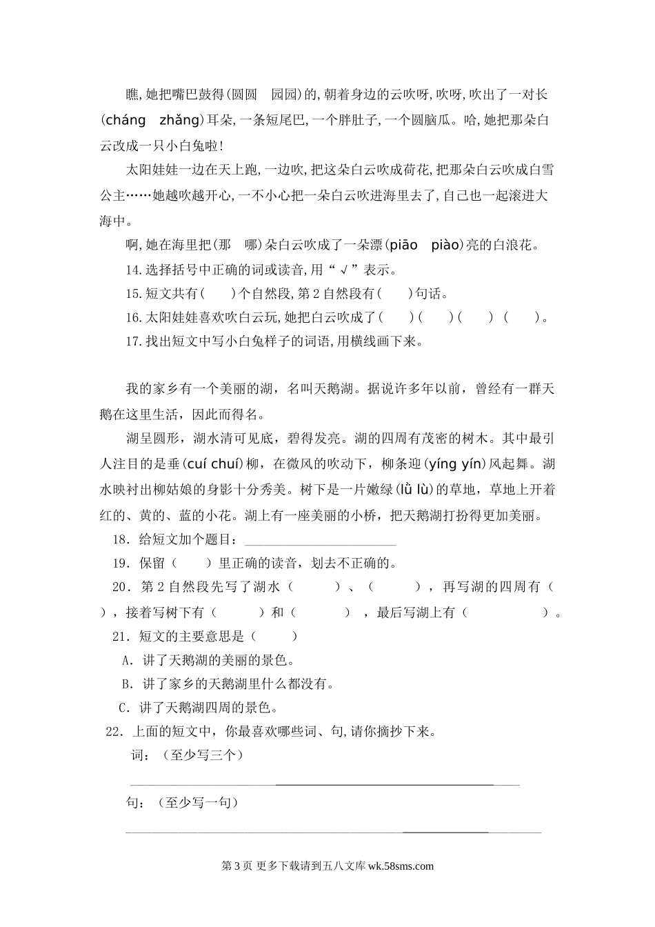 2021年部编版二年级语文下册课外阅读专项练习题及答案.doc_第3页