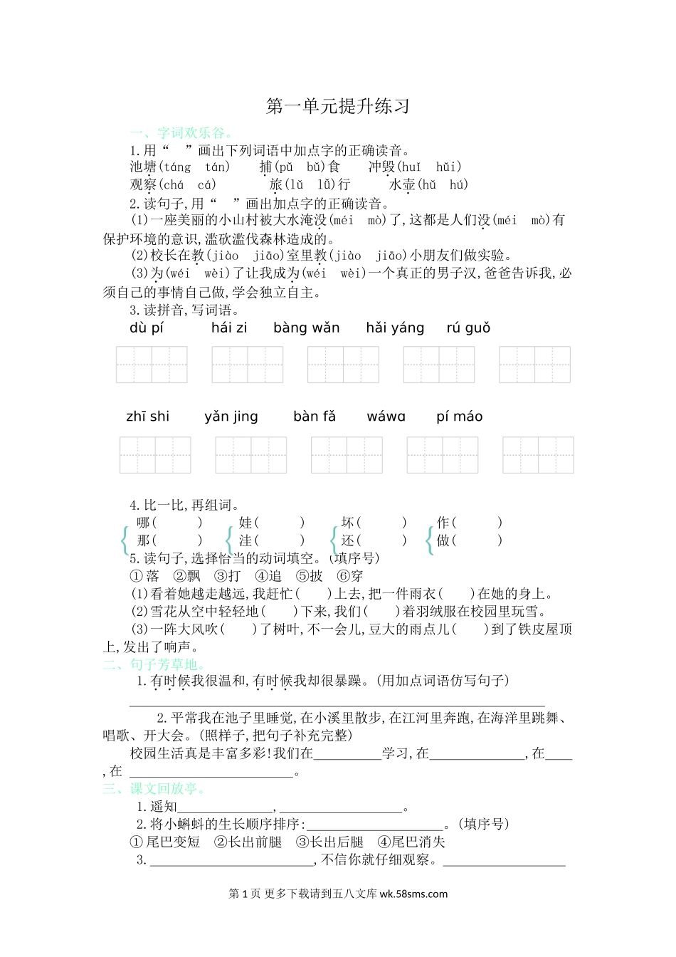 第一单元提升练习一、字词欢乐谷。1.用“􀳫”画出下列词语中加点字的正确读音。池塘(tángtán)捕(pǔbǔ)食冲毁(huǐhǔi)观察(chácá)旅(lǔlǚ)行水壶(hǔhú)2.读句子,用“􀳫”画出加点字的正确读音。(1)一...