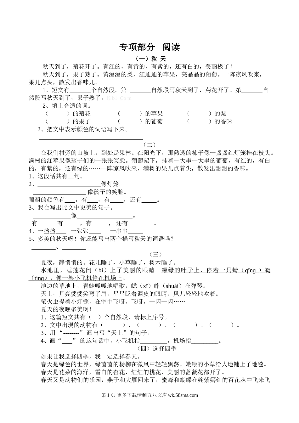 专项部分阅读(一)秋天秋天到了,菊花开了。有红的,有黄的,有紫的,还有白的,美丽极了!秋天到了,果子熟了。黄澄澄的梨,红通通的苹果,亮晶晶的葡萄。一阵凉风吹来,果儿点头,散发出香味儿。1、短文有个自...