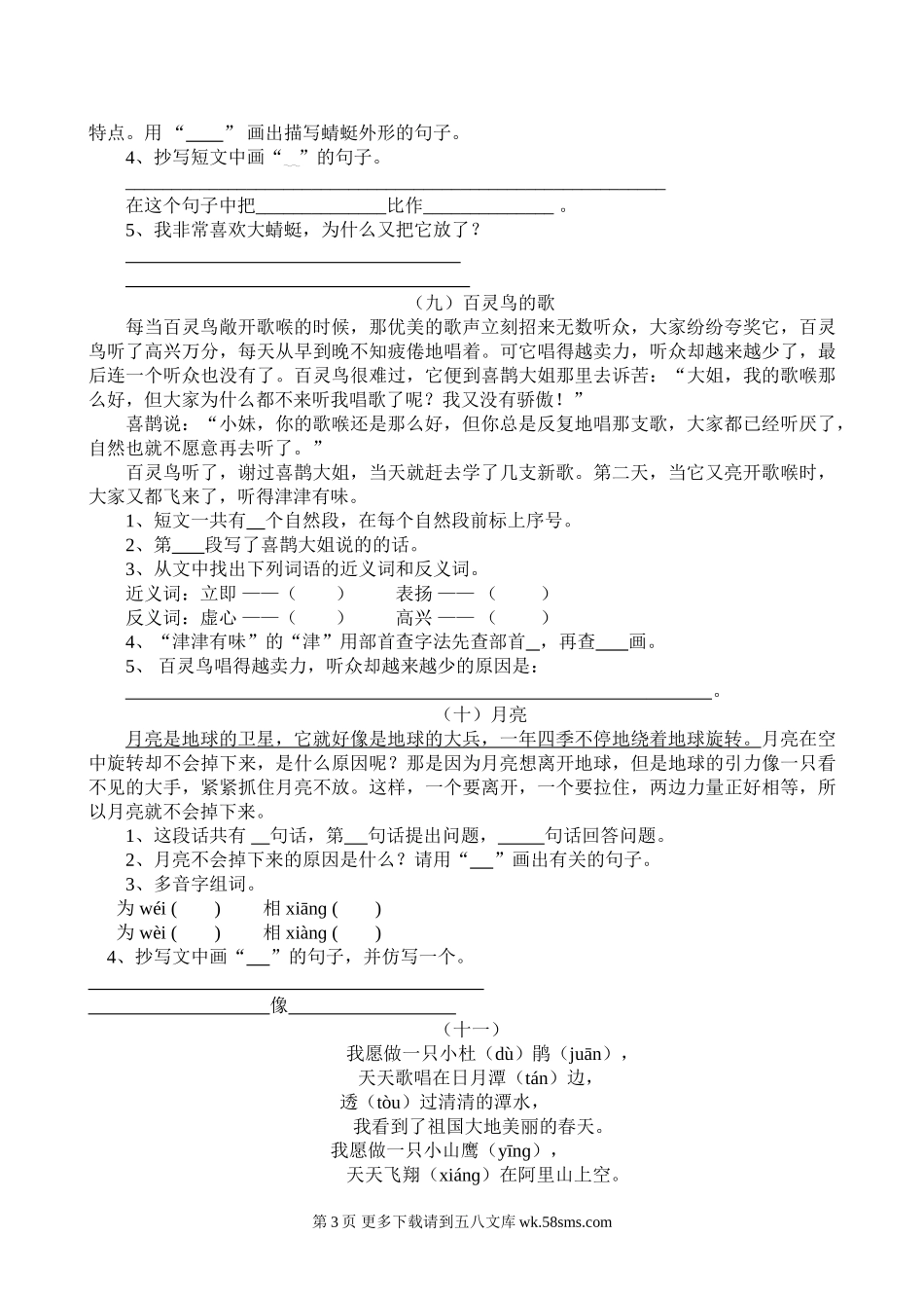 二年级语文上册阅读专项复习题及答案.doc_第3页