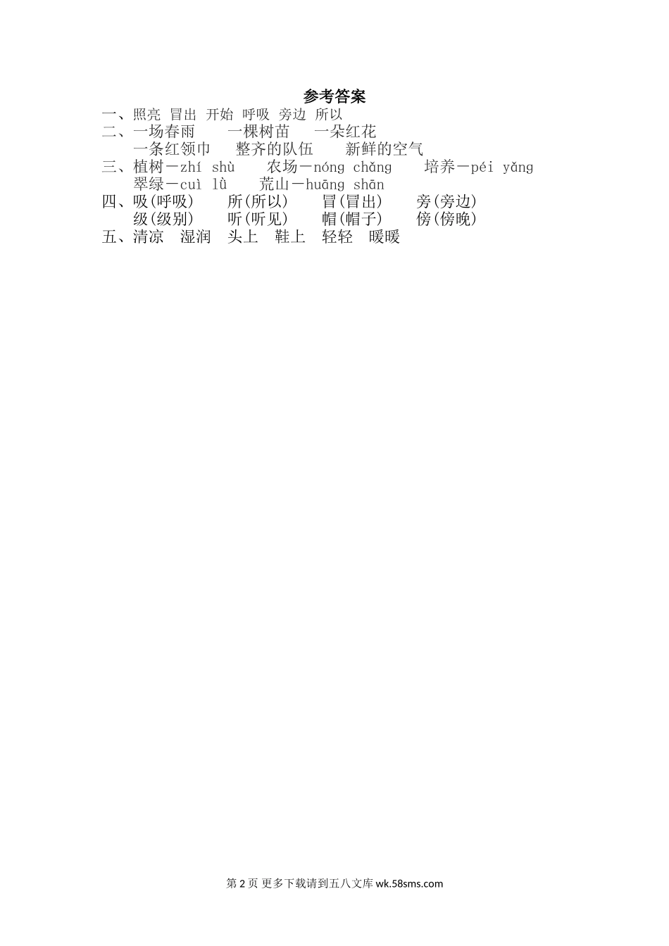 4.1植树的季节一、看拼音,写词语。zhàoliàngmàochūkāishǐhūxīpángbiānsuǒyǐ二、填上适当的词语,再读一读。一()春雨一()树苗一()红花一()红领巾()的队伍()的空气三、读一读,连一连。植...