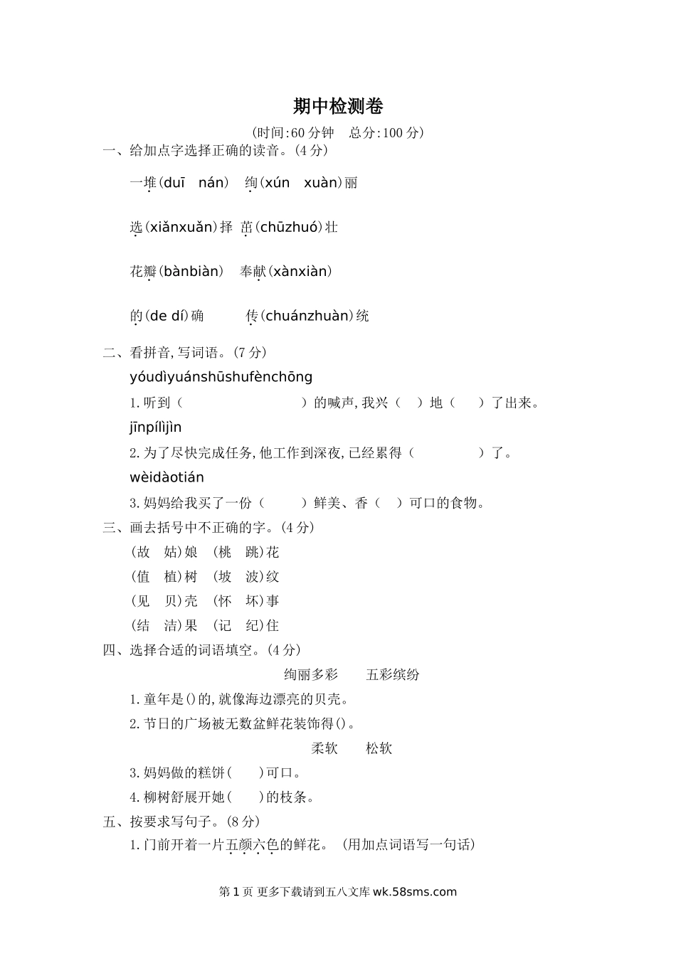 期中检测卷(时间:60分钟总分:100分)一、给加点字选择正确的读音。(4分)一堆(duīnán)绚(xúnxuàn)丽选(xiǎnxuǎn)择茁(chūzhuó)壮花瓣(bànbiàn)奉献(xànxiàn)的(dedí)确传(chuánzhuàn)统二、看拼音,...