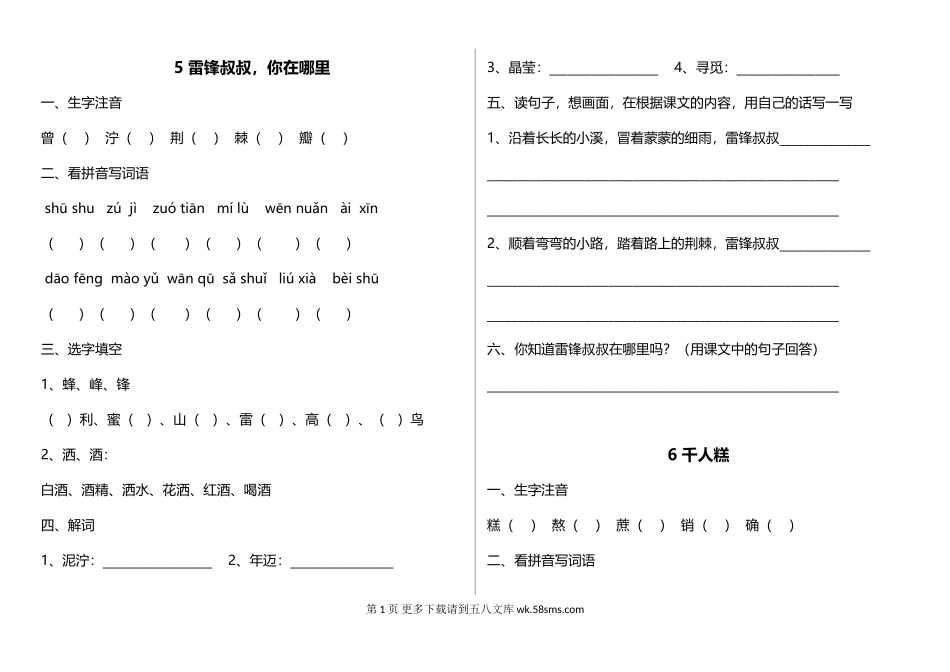 5雷锋叔叔,你在哪里一、生字注音曾()泞()荆()棘()瓣()二、看拼音写词语shūshuzújìzuótiānmílùwēnnuǎnàixīn()()()()()()dāofēnɡmàoyǔwānqūsǎshuǐliúxiàbèishū()...