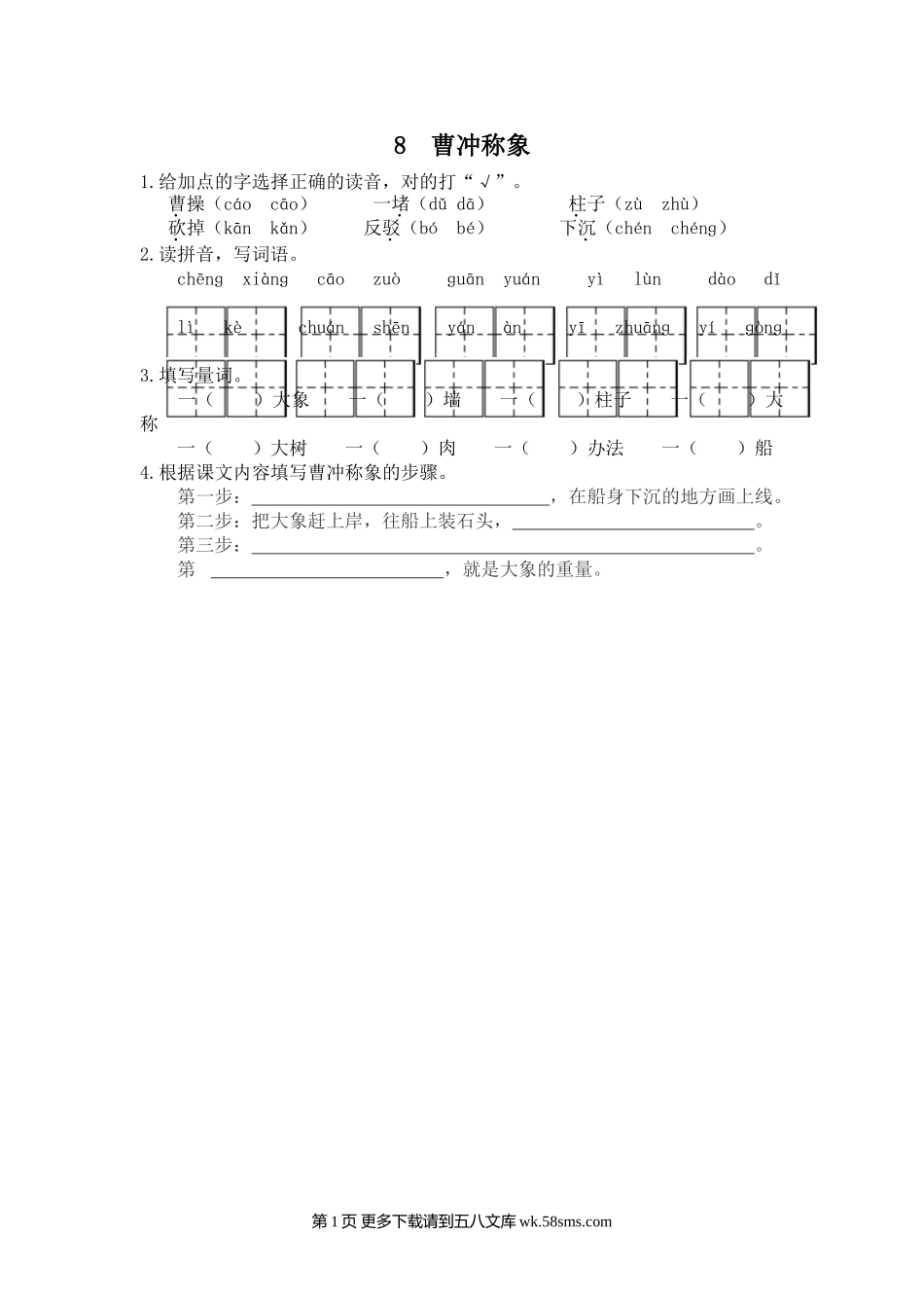 8曹冲称象1.给加点的字选择正确的读音,对的打“√”。曹操(cáocāo)一堵(dǔdā)柱子(zùzhù)砍掉(kānkǎn)反驳(bóbé)下沉(chénchénɡ)2.读拼音,写词语。chēnɡxiànɡcāozuòɡuānyuán...