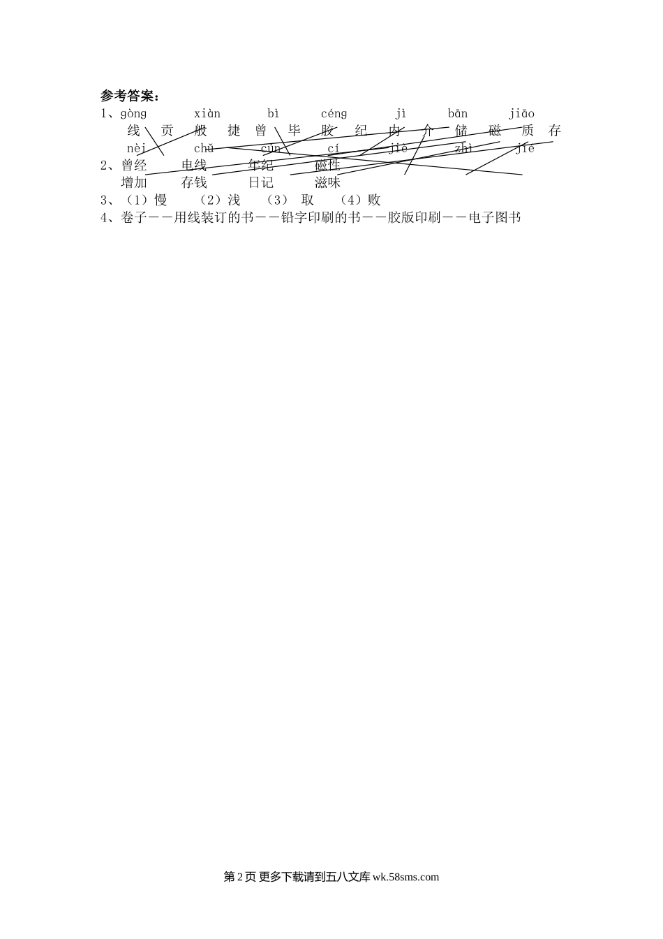 快乐读书屋九几种有趣的书1.把词语与相对应的音节连一连。ɡònɡxiànbìcénɡjìbānjiāo线贡般捷曾毕胶纪内介储磁质存nèichǔcúncíjièzhìjié2.形近字组词。曾()线()纪()磁()增()钱()记(...