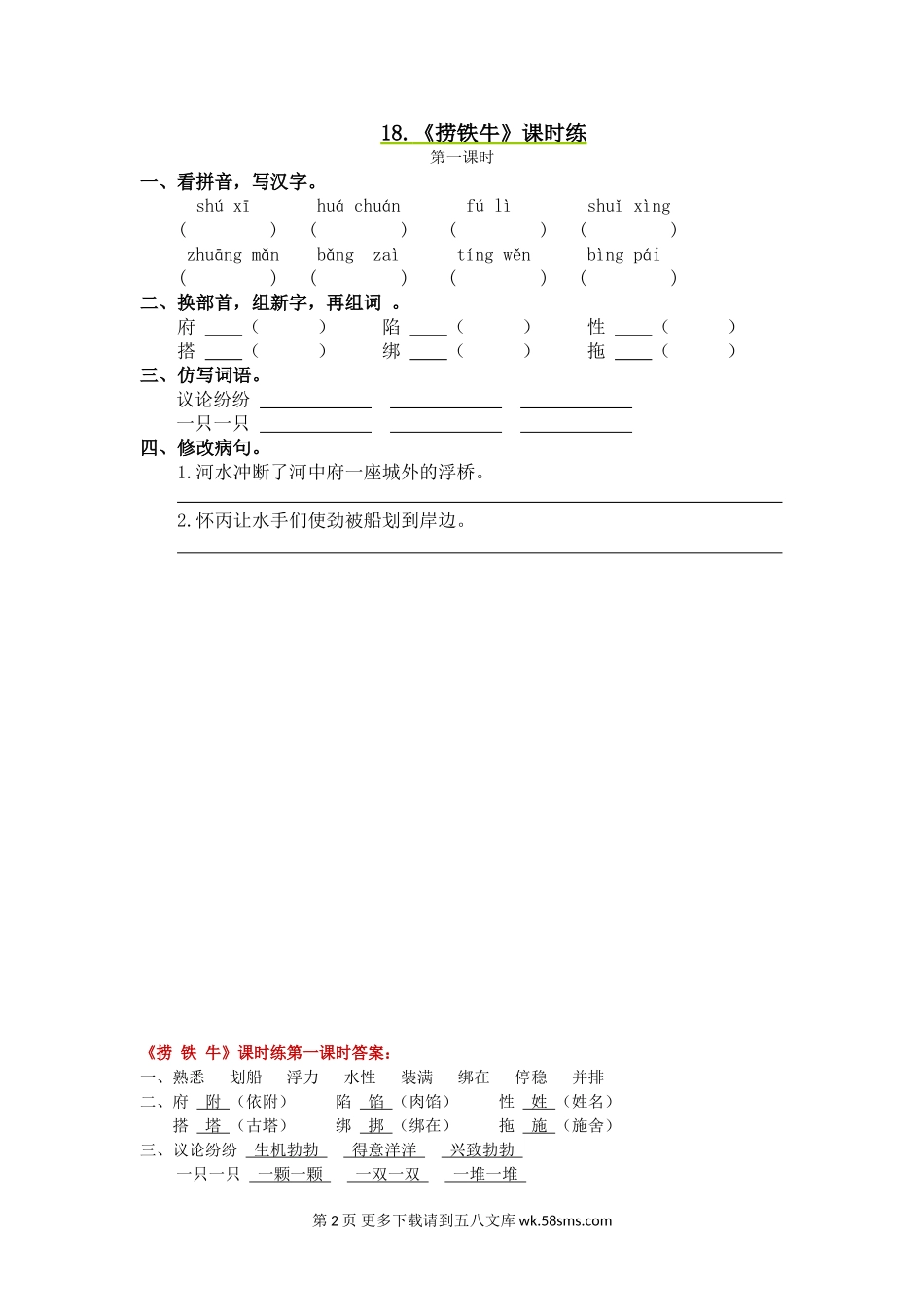 18.《捞铁牛》课时练第二课时一、选字填空。借措滑划性姓()施()船()名()书()冰()别二、在括号里填上合适的词语。()的铁牛()的绳子()的木料()地拴住()地划船()地议论三、根据课文内容填一...