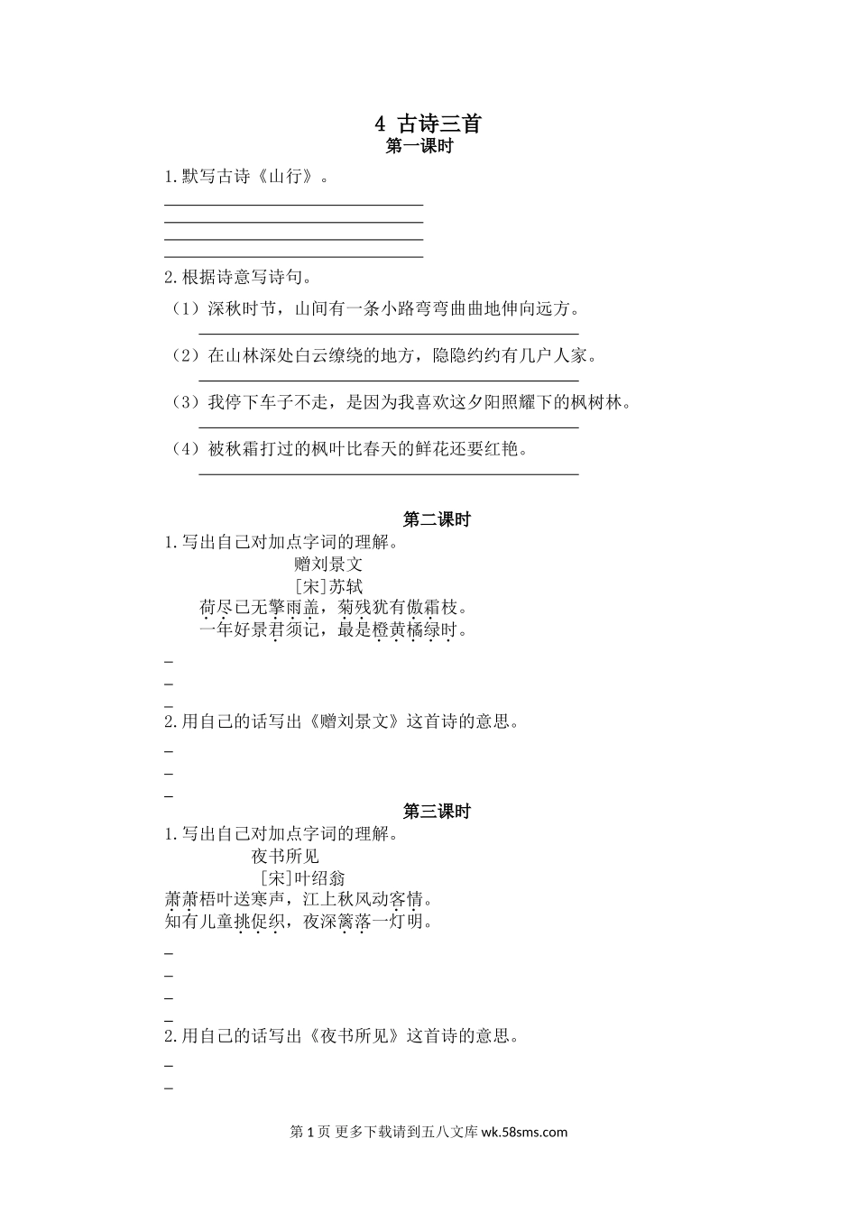 4古诗三首第一课时1.默写古诗《山行》。2.根据诗意写诗句。(1)深秋时节,山间有一条小路弯弯曲曲地伸向远方。(2)在山林深处白云缭绕的地方,隐隐约约有几户人家。(3)我停下车子不走,是因为我喜欢这夕阳照...