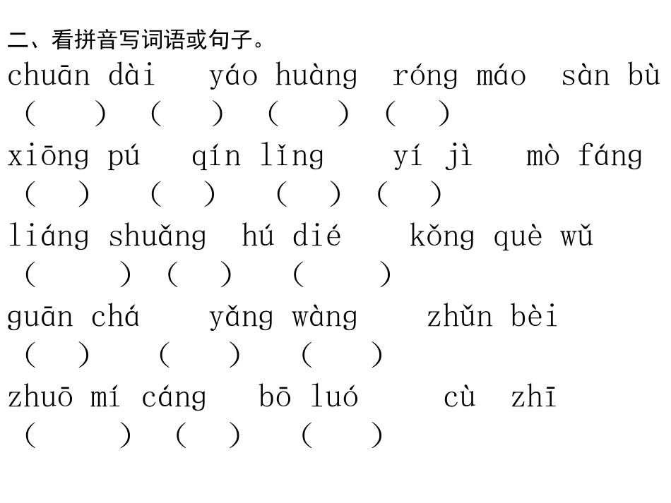 一、读一读,并归类坪瓣顶震卷藏坊扇命深紧敢胸前鼻音:()后鼻音:()瓣震卷扇深紧敢坪顶藏坊命胸二、看拼音写词语或句子。chuāndàiyáohuànɡrónɡmáosànbù()()()()xiōnɡpúqínlǐnɡyíj...