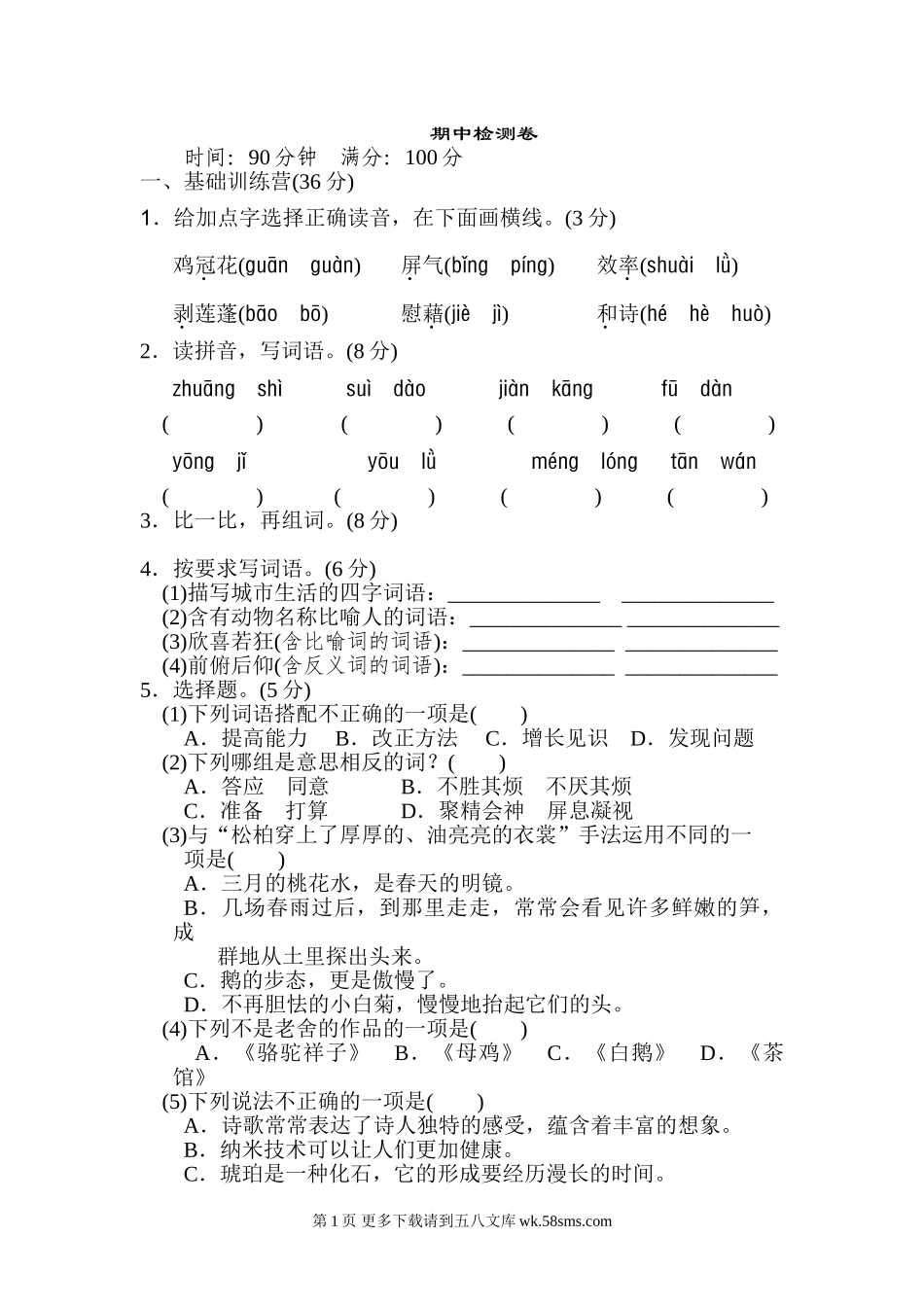 期中检测卷时间:90分钟满分:100分一、基础训练营(36分)1.给加点字选择正确读音,在下面画横线。(3分)鸡冠花(guānguàn)屏气(bǐngpíng)效率(shuàilǜ)剥莲蓬(bāobō)慰藉(jièjì)和诗(héhèhuò)2.读拼...