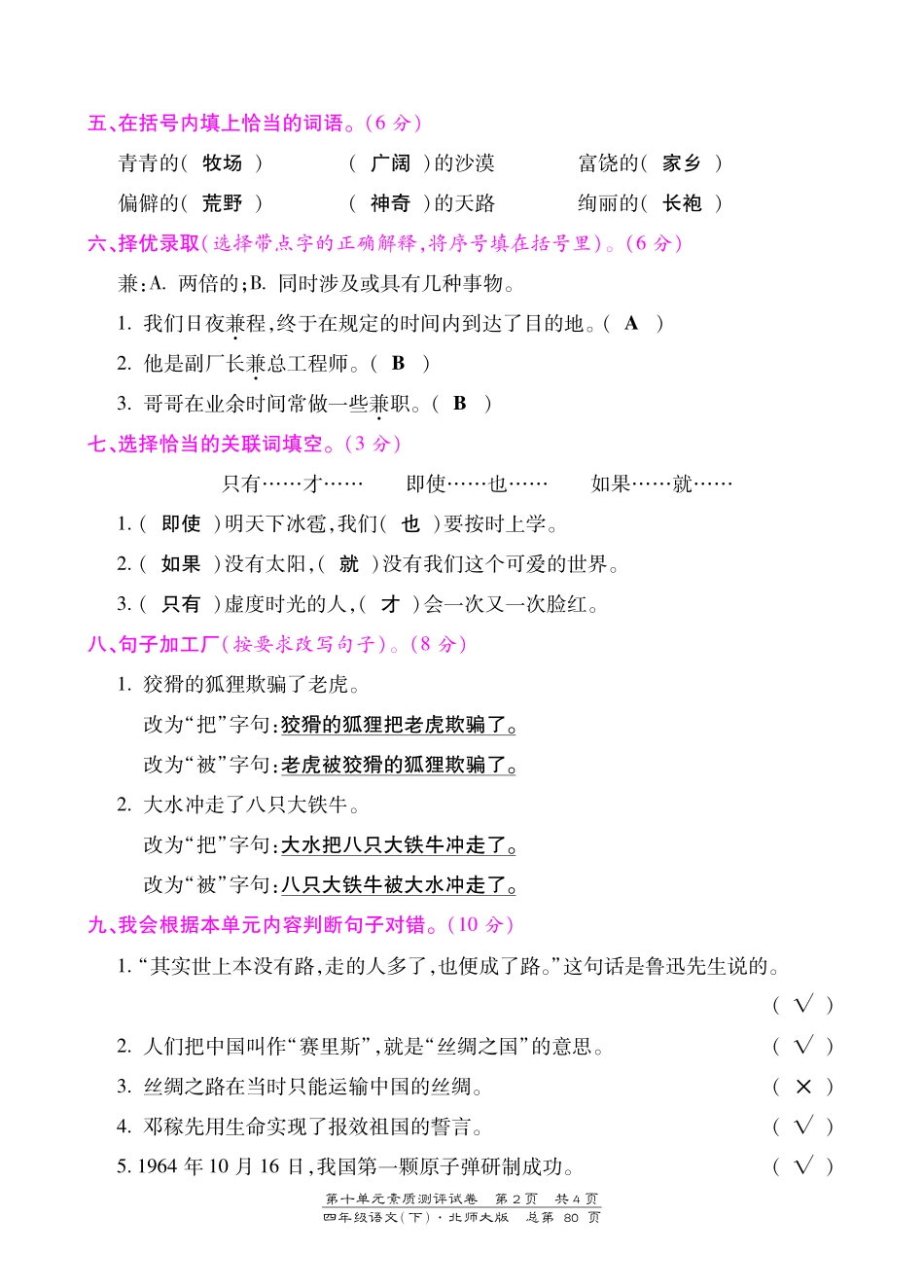 北师大版四年级语文下册第十单元测试卷含答案.pdf