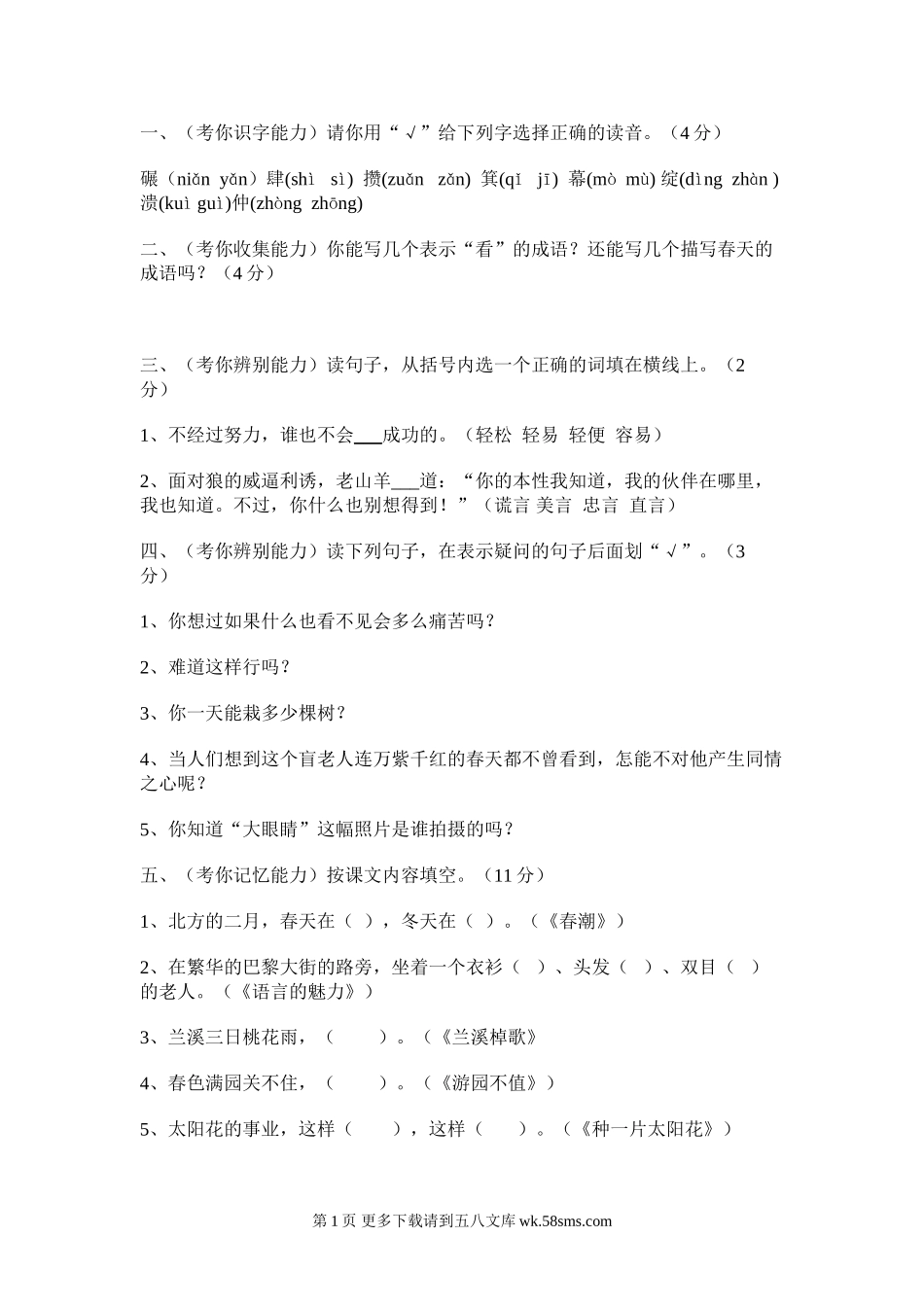 一、(考你识字能力)请你用“√”给下列字选择正确的读音。(4分)碾(niǎnyǎn)肆(shìsì)攒(zuǎnzǎn)箕(qǐjī)幕(mòmù)绽(dìngzhàn)溃(kuìguì)仲(zhòngzhōng)二、(考你收集能力)你能写几个表...