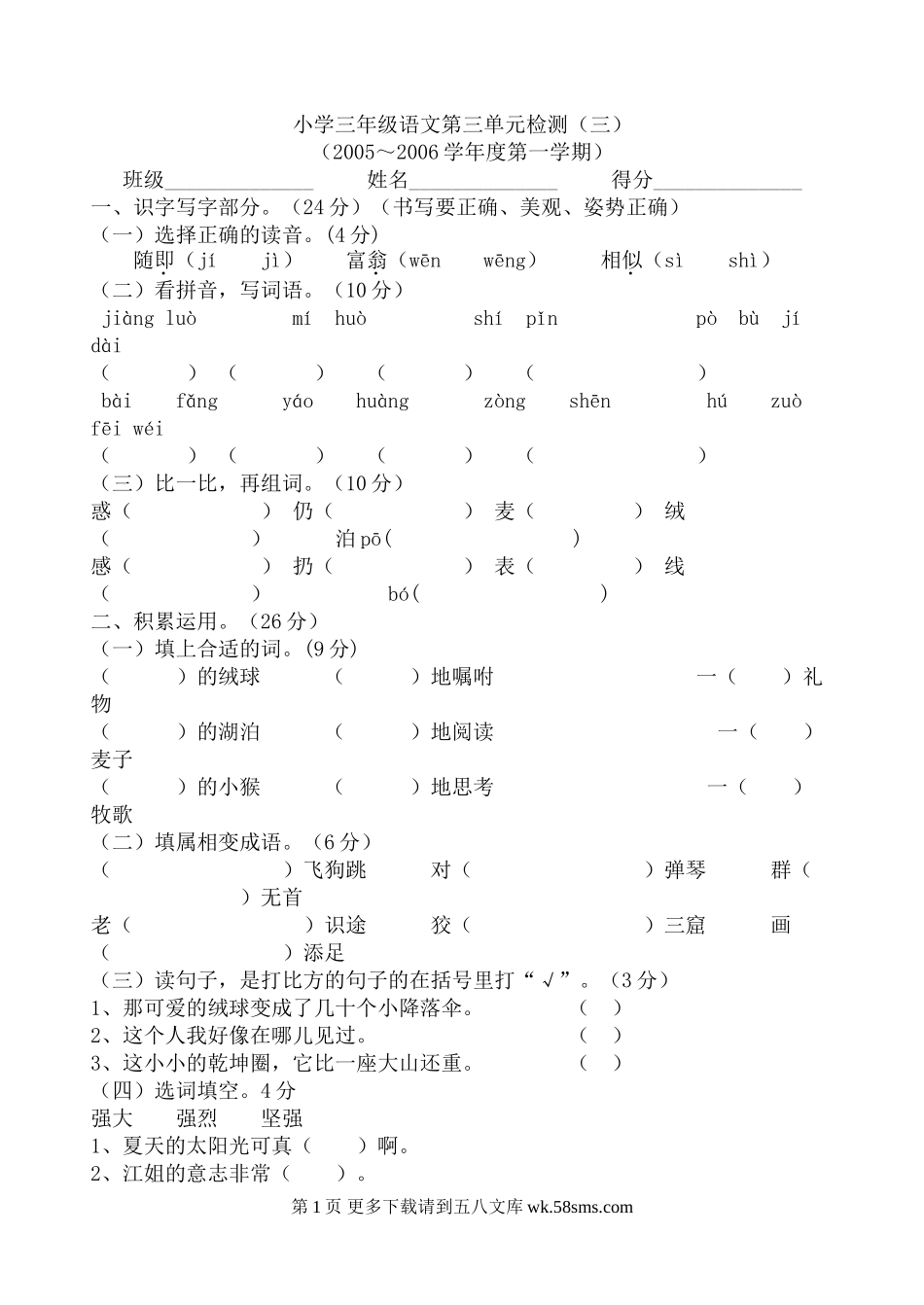 小学三年级语文第三单元检测(三)(2005~2006学年度第一学期)班级______________姓名______________得分______________一、识字写字部分。(24分)(书写要正确、美观、姿势正确)(一)选择正确的读音。(4分)...