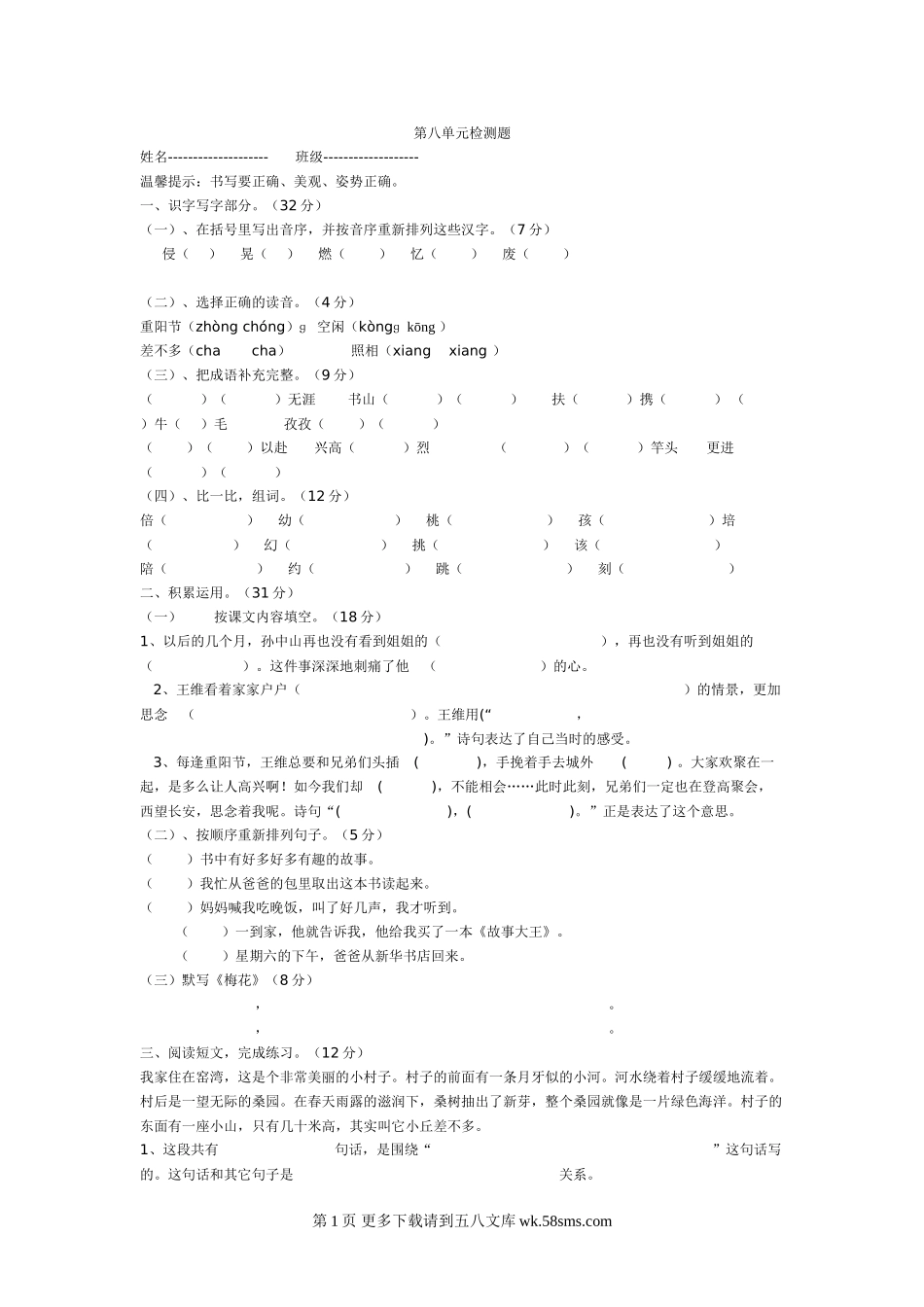 第八单元检测题姓名--------------------班级-------------------温馨提示:书写要正确、美观、姿势正确。一、识字写字部分。(32分)(一)、在括号里写出音序,并按音序重新排列这些汉字。(7分)侵()晃()...