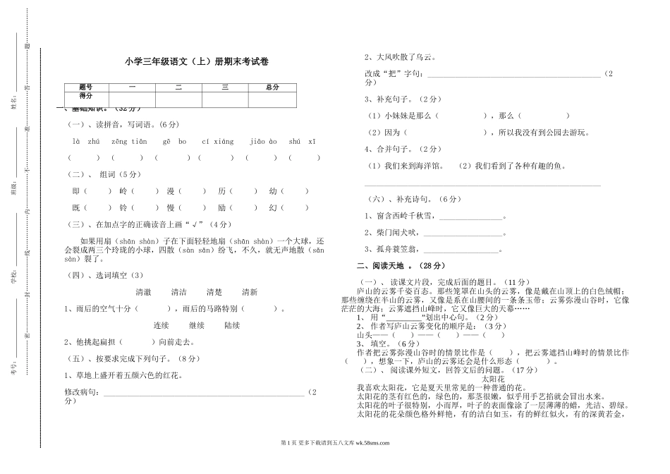 小学三年级语文(上)册期末考试卷.doc_第1页
