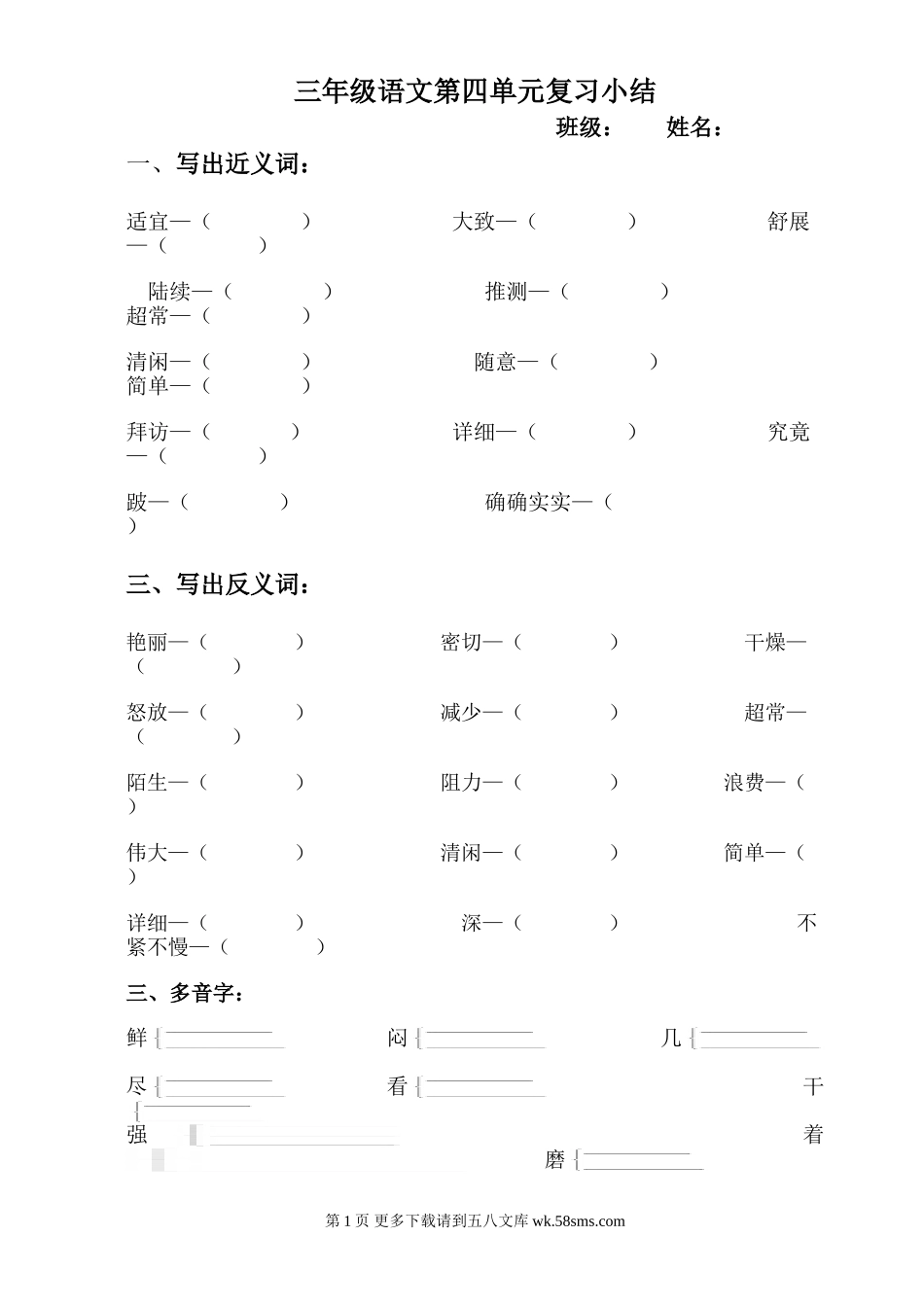 小学三年级语文上册第四单元复习题(近反义词、多音字).doc_第1页