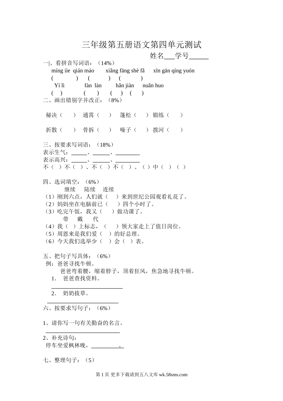 三年级第五册语文第四单元测试姓名学号一|、看拼音写词语:(14%)míngiìeqiánmáoxiǎngfāngshèfǎxīngānqíngyuón()()()Yìlìfànlànhǎnjiànnuǎnhuo()()()()二、画出错别字并改正:(8%)秘决()...