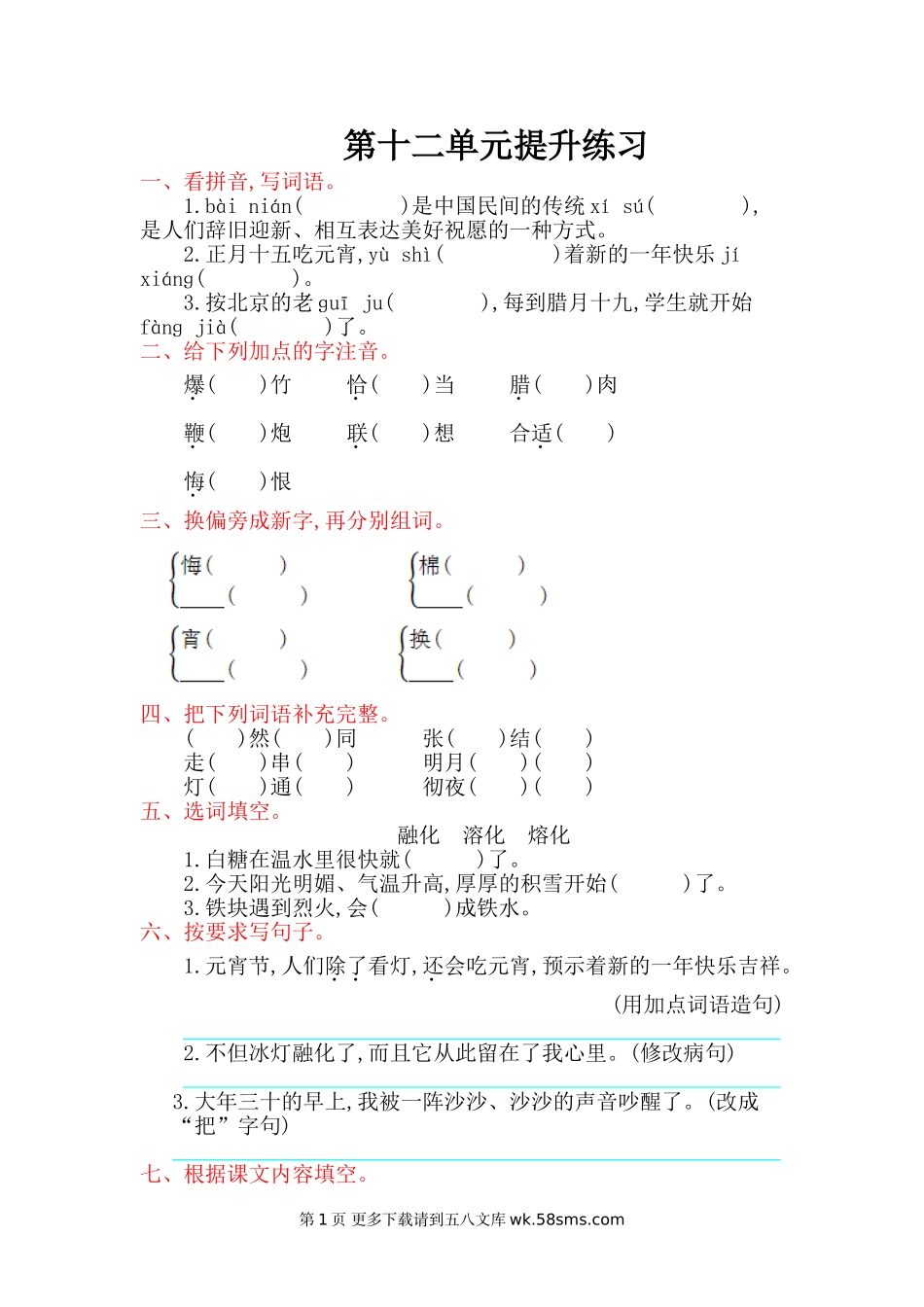 第十二单元提升练习一、看拼音,写词语。1.bàinián()是中国民间的传统xísú(),是人们辞旧迎新、相互表达美好祝愿的一种方式。2.正月十五吃元宵,yùshì()着新的一年快乐jíxiánɡ()。3.按北京的老ɡuīju(),每...