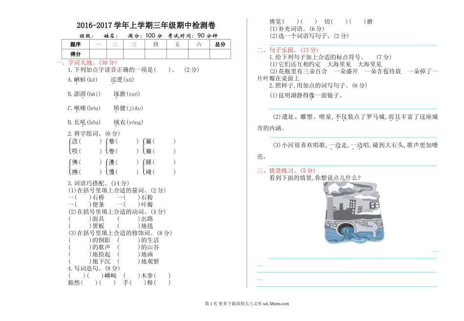 2016-2017学年上学期三年级期中检测卷班级:姓名:满分:100分考试时间:90分钟题序一二三四五六总分得分一、字词天地。(30分)1.下列加点字读音正确的一项是()。(2分)A.蝌蚪(kē)巡逻(xū)B.澎湃(bài)琢磨(zuó)...