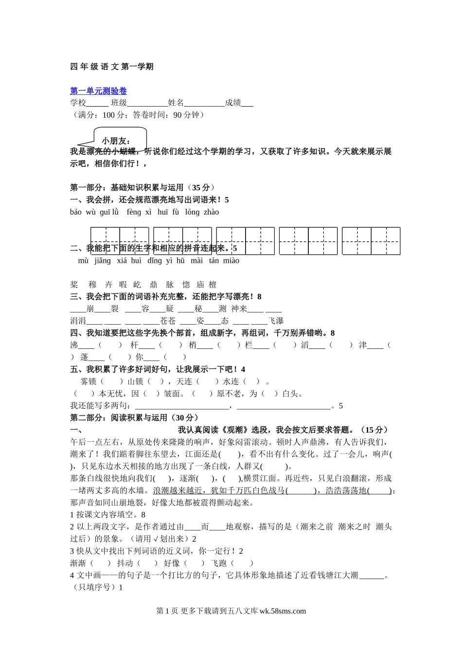 四年级语文第一学期第一单元测验卷学校班级__________姓名__________成绩(满分:100分;答卷时间:90分钟)我是漂亮的小蝴蝶,听说你们经过这个学期的学习,又获取了许多知识。今天就来展示展示吧,相信你们行!...