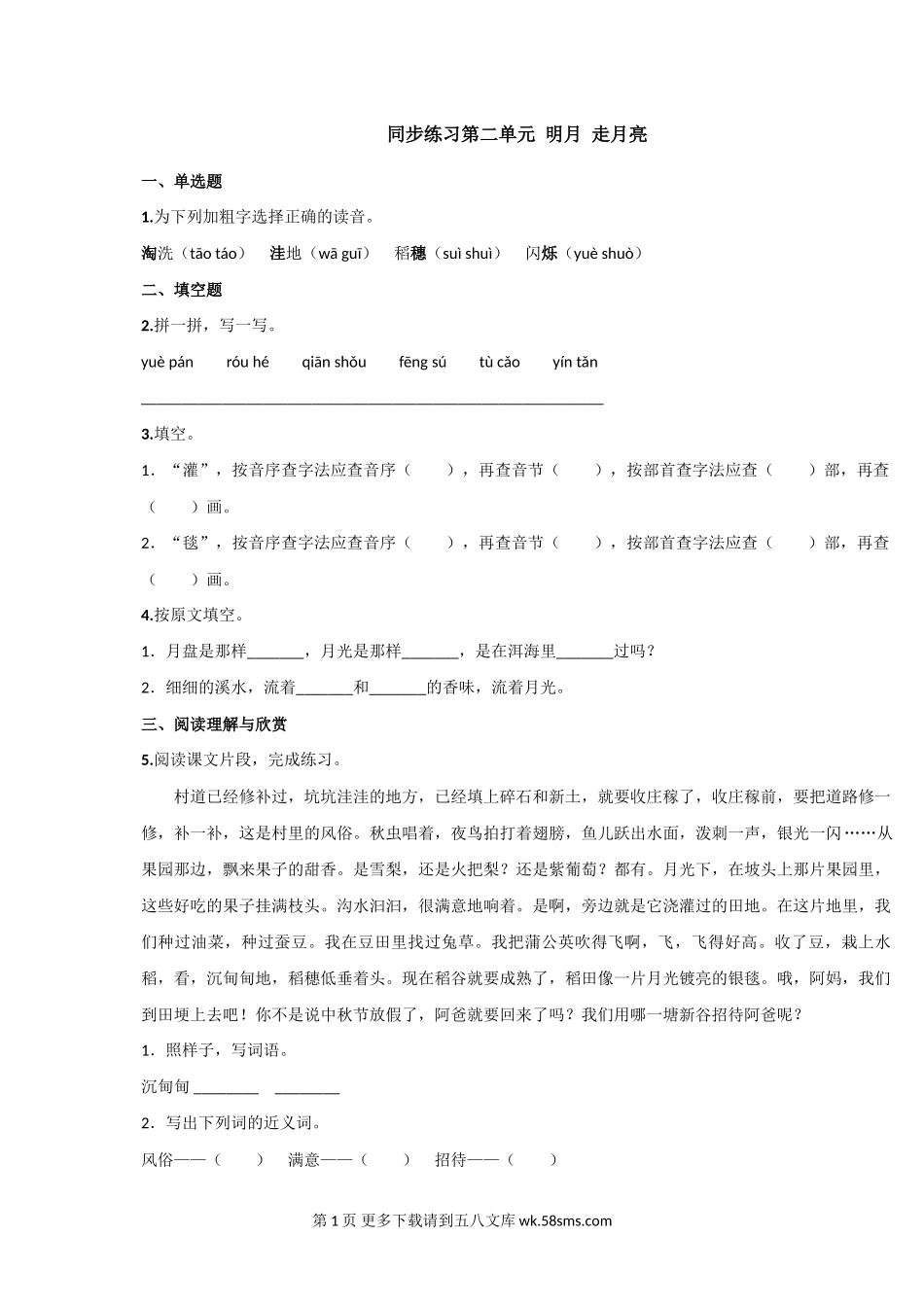 同步练习第二单元明月走月亮一、单选题1.为下列加粗字选择正确的读音。淘洗(tāotáo)洼地(wāguī)稻穗(suìshuì)闪烁(yuèshuò)二、填空题2.拼一拼,写一写。yuèpánróuhéqiānshǒufēngsútùc...
