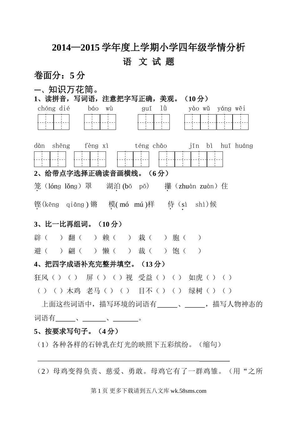 2014—2015学年度上学期小学四年级学情分析语文试题卷面分:5分一、知识万花筒。1、读拼音,写词语,注意把字写正确,美观。(10分)chóngdiébáowùɡuīlǜyàowǔyánɡwēidànshēngfènɡxìténgchāoj...