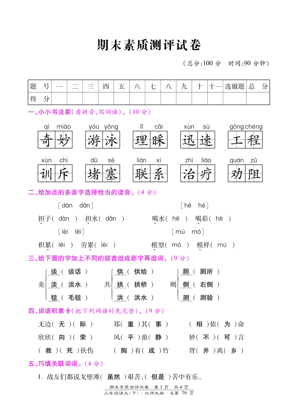 北师大版三年级语文下册期末测试卷含答案.pdf_第3页
