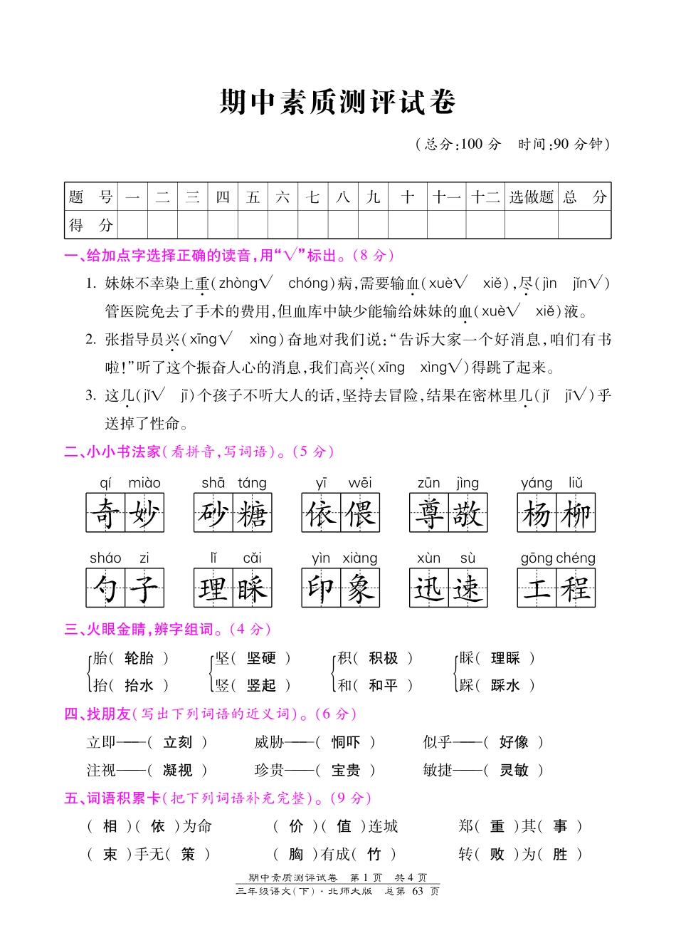 北师大版三年级语文下册期中测试卷含答案.pdf