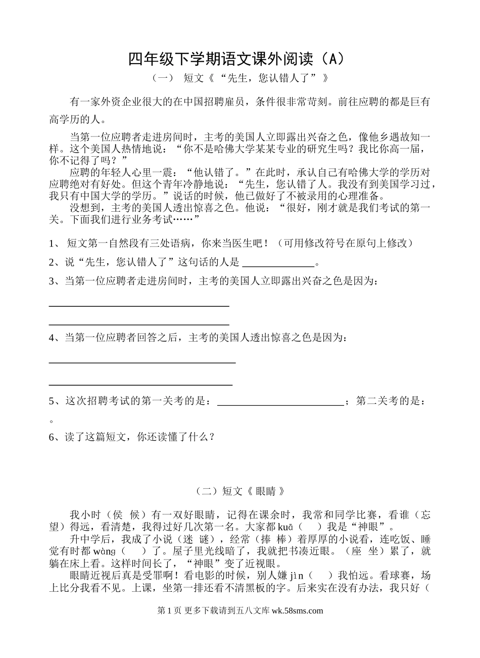 四年级下学期语文课外阅读(A)(一)短文《“先生,您认错人了”》有一家外资企业很大的在中国招聘雇员,条件很非常苛刻。前往应聘的都是巨有高学历的人。当第一位应聘者走进房间时,主考的美国人立即露出兴奋之...