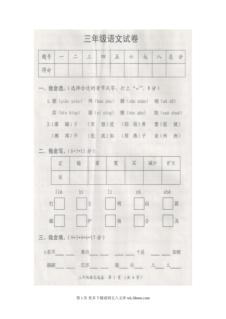 赤壁市2013年春三年级语文下册期末考试卷.doc_第3页